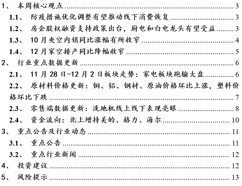 防疫措施优化调整有望推动线下消费恢复;房企股权融资支持政策出台,厨电和白电龙头有望受益;央空10月内销出货同比涨幅有所收窄。