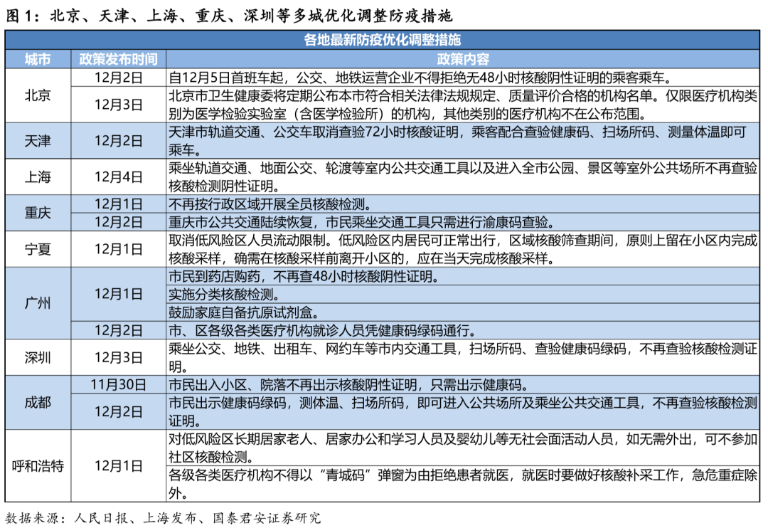 本周北京、上海、深圳等多城优化调整防疫措施,有望促进日常出行和人员流动。北京、天津、上海、重庆、深圳、成都等多城公共交通不再查验核酸证明,为人员出行提供便利。重庆、广州、呼和浩特等地对核酸检验测试方式来进行优化调整,宁夏取消低风险区人员流动限制,上海进入公园、景区等室外公共场所不再查验核酸证明,有望促进人员流动。