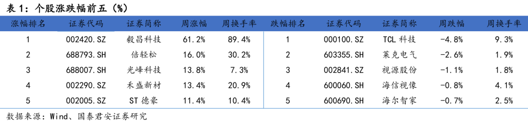 个股中,涨幅前五名是毅昌科技、倍轻松、光峰科技、禾盛新材、ST德豪;跌幅前五名是TCL科技、莱克电气、视源股份、海信视像、海尔智家。