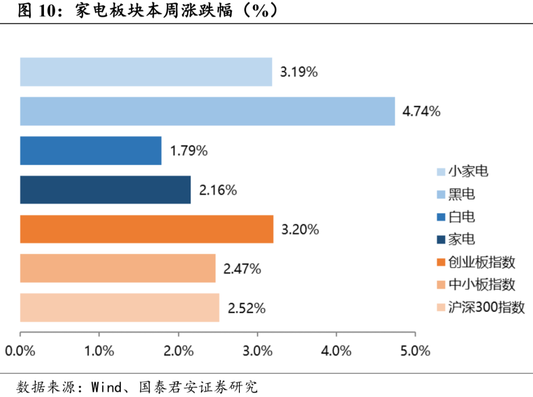 本周沪深300指数+2.52%,创业板指数+3.2%,中小板指数+2.47%,家电板块+2.16%。从细分板块看白电、黑电、小家电涨跌幅分别为+1.79%、+4.74%、+3.19%。