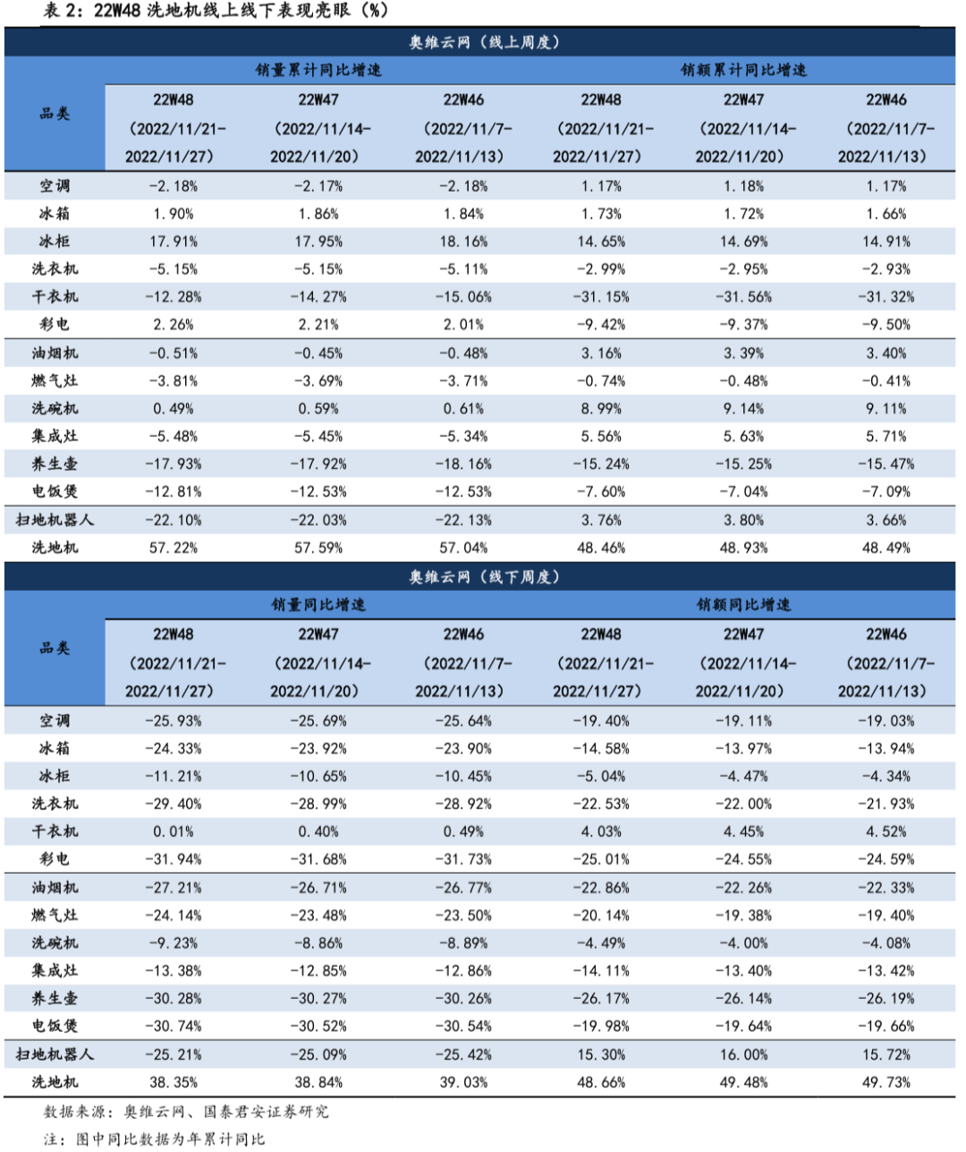 2.3、零售端数据更新:洗地机线)奥维端零售年累计同比多个方面数据显示:线上和线下洗地机表现较好,其中洗地机线.46%/+48.66%;线上冰柜表现较好,销量年累计同比+17.91%,销额年累计同比为+14.65%;线下干衣机表现较好,销量年累计同比+0.01%;销额年累计同比+4.03%;线下扫地机器人表现持续亮眼,销额年累计同比为+15.30%。