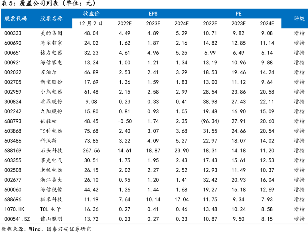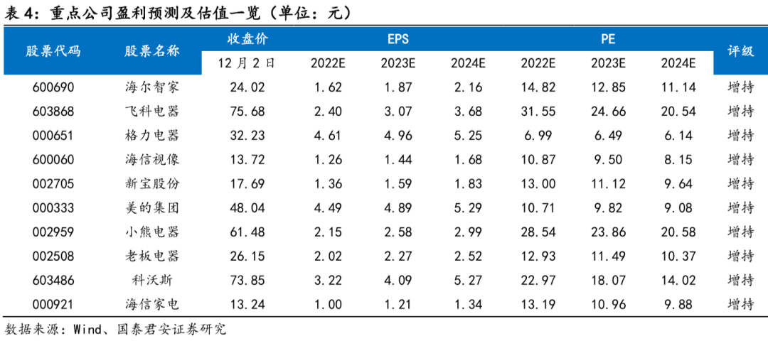 投资建议:防疫措施优化调整有望推动线下消费恢复;房企股权融资支持政策出台,厨电和白电龙头有望受益;央空10月内销出货同比涨幅有所收窄。考虑到原材料价格下降以及地产逐渐恢复的情绪修复阶段,我们大家都认为前期被压制的估值有望得到修复,基本面的复苏预期也随着持续的宏观政策出台有所提升,家电板块有望修复,建议关注白电和厨电龙头。个股方面推荐高端化多品牌领先布局效率优化的海尔智家(14.8X)、产品优化,七夕节促销热卖的飞科电器(31.6X)、新零售渠道改革取得进展,销售费用优化明显的格力电器(7.0X)、激光显示技术龙头海信视像(10.9X)、解决摩飞国内商标使用权授权、有望分享摩飞海外业务增长的新宝股份(13.0X)、品类齐全、盈利能力逐步修复的美的集团(10.7X)、内销恢复弹性较强的小熊电器(28.5X)、轻装上阵的传统厨电龙头老板电器(12.9X)、清洁电器龙头科沃斯(23.0X)、中央空调稳健发展,家空及冰洗贡献业绩弹性的海信家电(13.2X)。